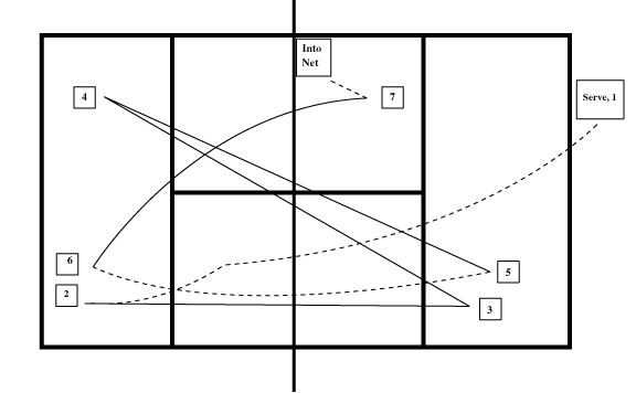 In the example Intermediate Accuracy rally above, the ball is struck seven times (each point of impact is labeled with a box). Shots 1-6 are all good shots, but shots 1 and 5 did not score points. The service never scores a point. Shot 5 did not score, because it was struck from the same quadrant of the court as the last shot (3) on that side of the court. Note that in the figures, shots that score are solid lines and shots that do not score are dotted.